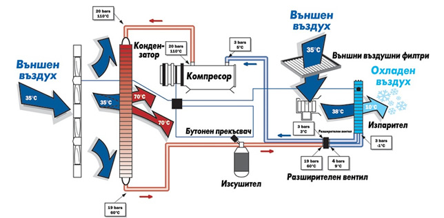 - Охлаждащата течност се транспортира до изпарител с температура около -1 ° C, а от там се отвежда през въздушни канали в кабината на превозното средство.